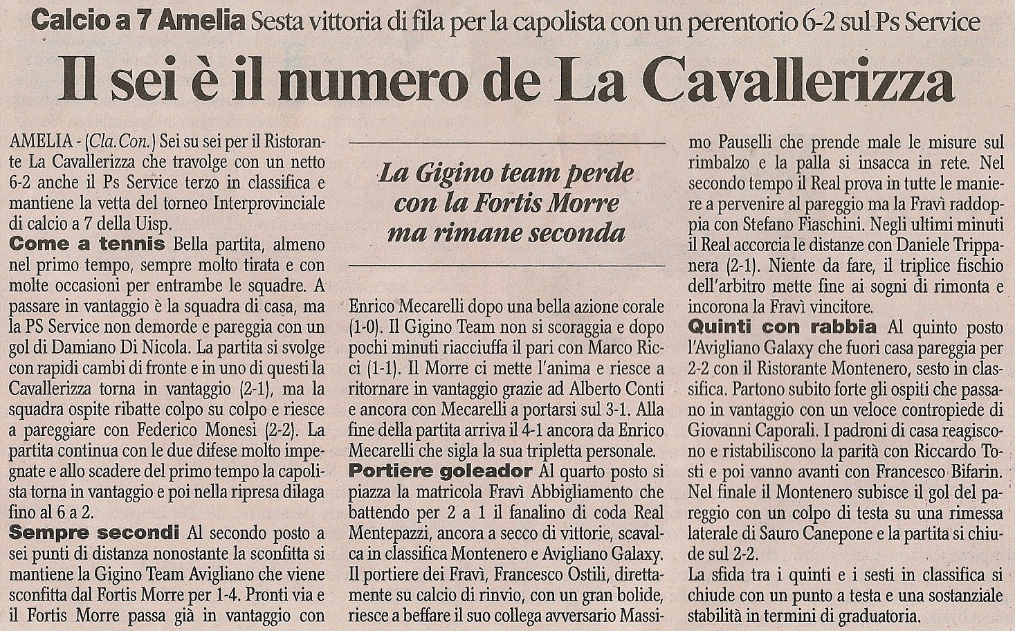 Portiere goleador Al quarto posto si piazza la matricola Fravì Abbigliamento che battendo per 2 a 1 il fanalino di coda Real Mentepazzi, ancora a secco di vittorie, scaval¬ca in classifica Montenero e Avigliano Galaxy. Il portiere dei Fravì, Francesco Ostili, direttamente su calcio di rinvio, con un gran bolide, riesce a beffare il suo collega avversario Massimo Pauselli che prende male le misure sul rimbalzo e la palla si insacca in rete. Nel secondo tempo il Real prova in tutte le maniere a pervenire al pareggio ma la Fravì raddoppia con Stefano Fiaschini. Negli ultimi minuti il Real accorcia le distanze con Daniele Trippanera (2-1). Niente da fare, il triplice fischio dell'arbitro mette fine ai sogni di rimonta e incorona la Fravì vincitore.